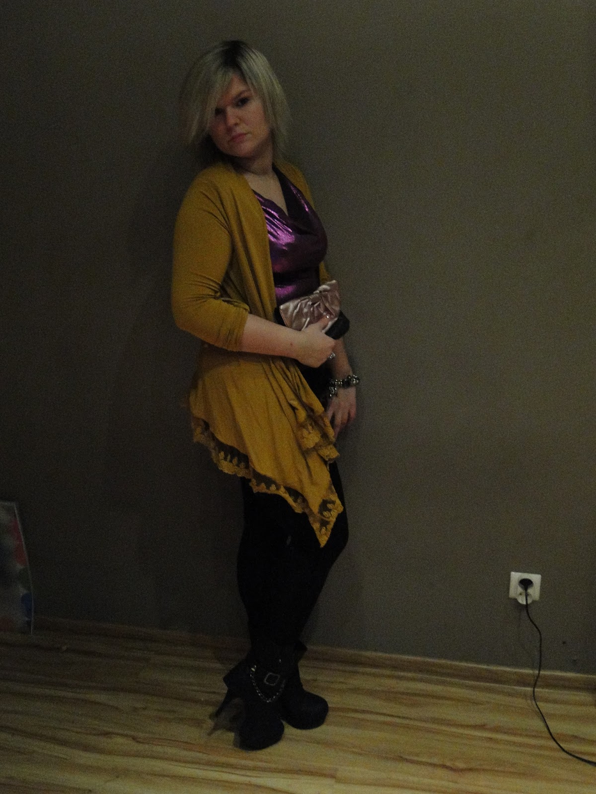 Za oknem chłodno, więc moja propzycja na dziś ma za zadanie troszkę rozweselić i ubarwić świat. W ostatnim czasie szaleje za kolorem musztardowym. Narzutkę w tym właśnie kolorze połączyłam z czarnymi narciarkami i fioletowym, błyszczącym topem. Całość uzupełnia mała kopertówka w kolorze metalicznej czerni i odrobiną różu, czarne botki na szpilce, pierścionek stylizowany na zaręczynowy Kate Middleton i niebieska bransoletka.